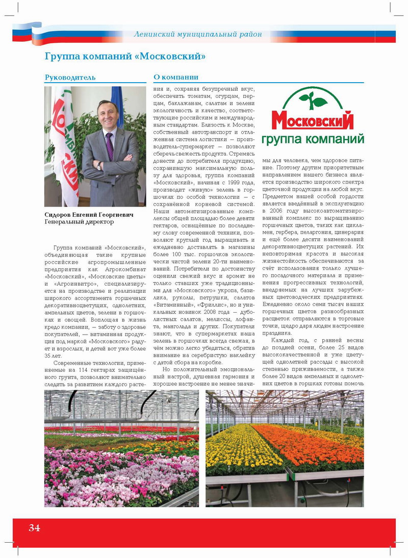 Группа компаний «Московский», объединяющая такие крупные российские агропромышленные предприятия как Агрокомбинат «Московский», «Московские цветы» и «Агроинвитро», специализируется на производстве и реализации широкого ассортимента горшечных декоративноцветущих, однолетних, ампельных цветов, зелени в горшочках и овощей. Воплощая в жизнь кредо компании, – заботу о здоровье покупателей, — витаминная продукция под маркой «Московского» радует и взрослых, и детей вот уже более 35 лет.