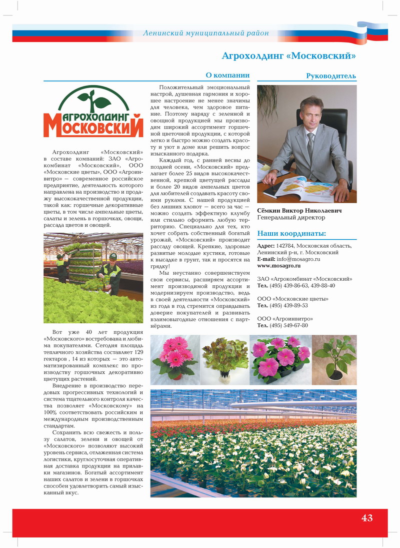 Агрохолдинг «Московский» в составе компаний: ЗАО «Агрокомбинат «Московский», ООО «Московские цветы», ООО «Агроинвитро» – современное российское предприятие, деятельность которого направлена на производство и продажу высококачественной продукции, такой как: горшечные декоративные цветы, в том числе ампельные цветы, салаты и зелень в горшочках, овощи, рассада цветов и овощей.