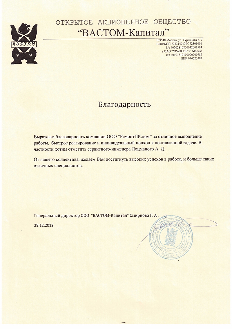Выражаем благодарность компании ООО РемонтПК.ком за отличное выполнение работы, быстрое реагирование и индивидуальный подход к поставленной задаче. В частности хотим отметить сервисного-инженера Лоцманого А. Д.