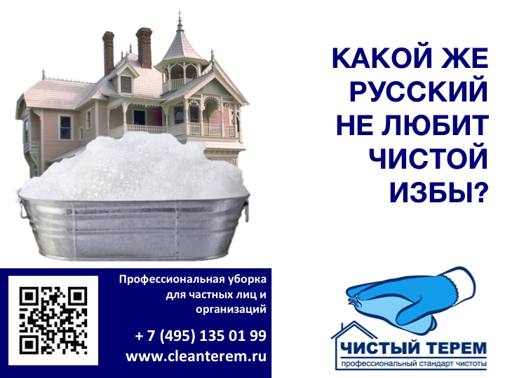 Вот такая реклама (присоединяю) уж очень посмешила и порадовала и захотел именно Чистый терем позвать убраться, всегда считал что люди с нормальным чувством юмора, как правило хорошие люди. Избенку мою помыли знатно. Уборщики и люди действительно хорошие.