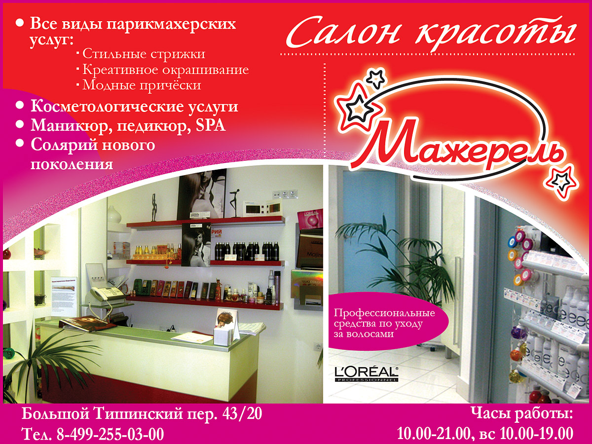 Салон красоты "Мажерель" открылся 24 мая 2007 года. Телефон: 8-499-255-03-00. Салон позиционирует себя не только как салон где предоставляют качественные услуги по созданию и поддерживанию вашего образа, но и место встречи друзей и коллег, партнеров.