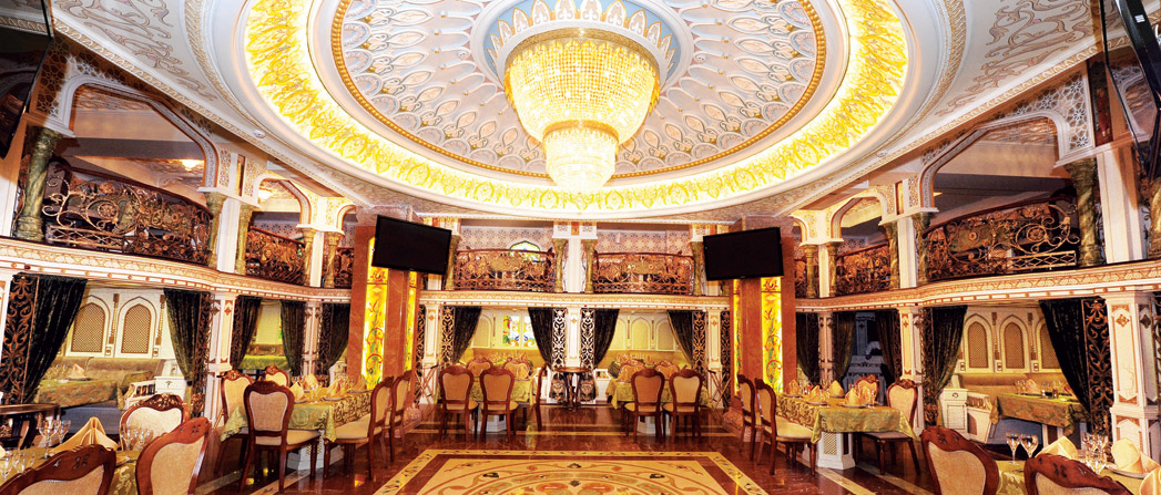 Ресторан идеально подходит для семейных праздников, роскошных пиршеств и будничного отдыха на широкую ногу. Этому способствует восточный колорит, представленный во всем богатстве и стиле. Каждый гость в такой обстановке может почувствовать себя героем арабской сказки. Дизайнерские черты в виде лепнины, кованных и кожаных деталей, мрамора, стекла и мозаики, живописных полотен способны поразить любое воображение.