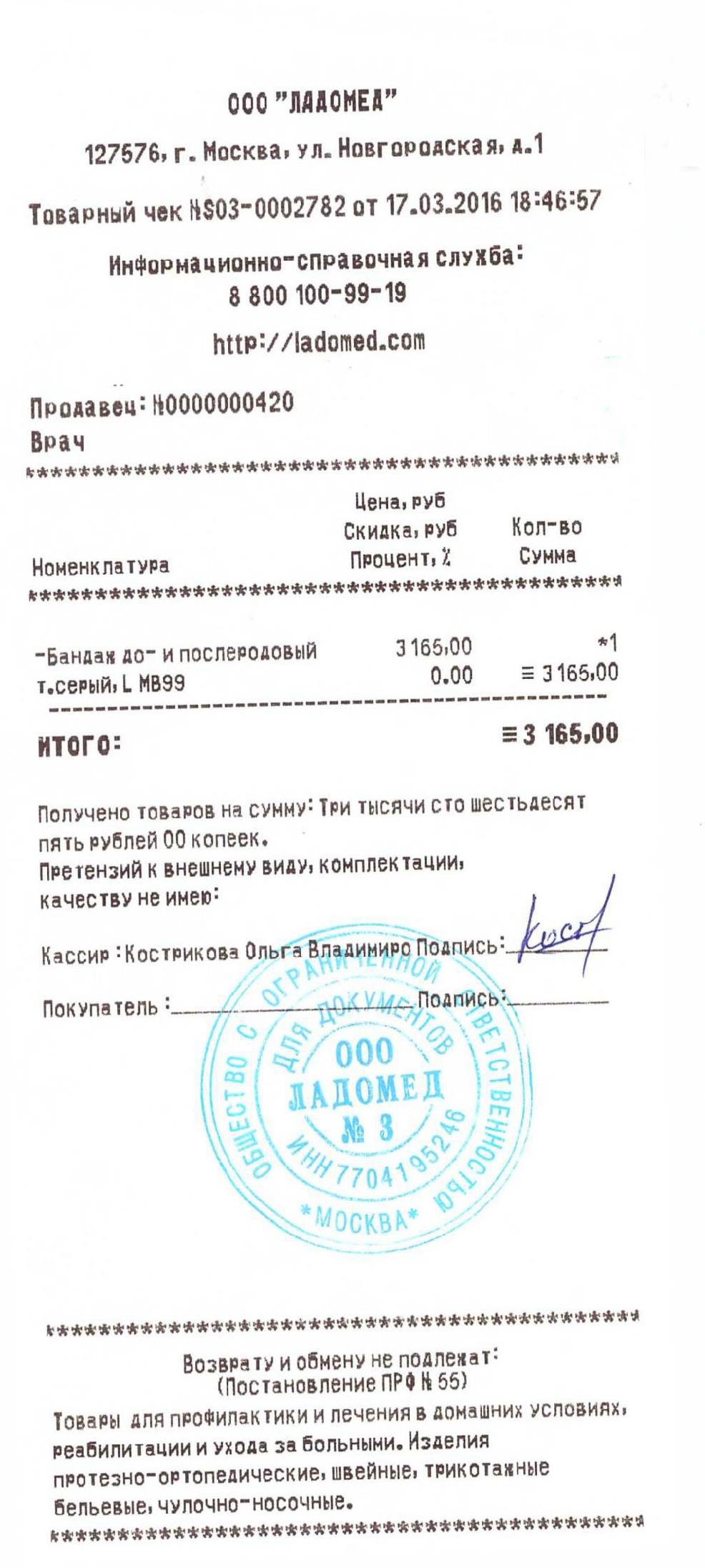 10 августа 2011 г.Здравствуйте! Во вторник (14 сентября) в магазине "Ладомед", по адресу Чудов пер. 5, я приобрела ортез тазобедренный. Товар приобретался не для меня, поэтому у продавца я спросила: смогу ли я обменять товар на другой размер, продавец меня заверила, что в течении двух ближайших дней это возможно. Товар лично в руки проверять мне не давали! Уже дома при осмотре ортеза и примерке мы обнаружили зацепки. Товар оказался некачественным! Размер так же не подошел. На следующий день, я пришла в магазин с просьбой обменять мне товар на размер меньше или вернуть деньги. Нужного размера не нашлось, а деньги возвращать мне отказались! Ссылаясь на Закон РФ "О защите прав потребителей" (закон о правах потребителя) от 07.02.1992, статья 18, мне ОБЯЗАНЫ вернуть деньги! Менеджер данного магазина, Евгения - ее телефон 8(499)245-00-40. Прошу принять меры!