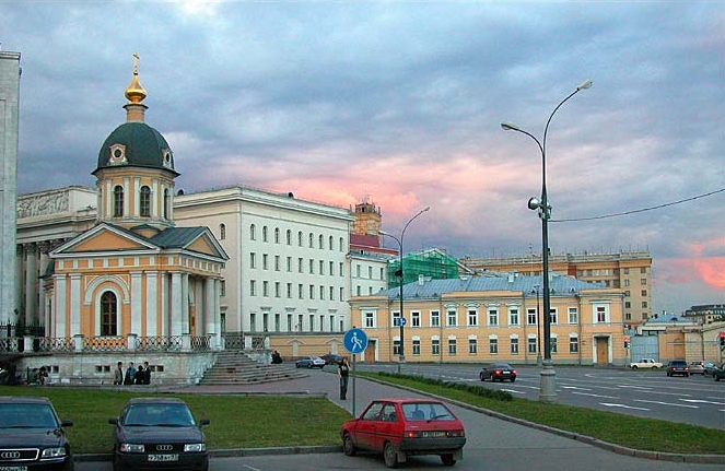 В XVII-XVIII веках вдоль крепостной стены и Арбатских ворот размещались торговый лавки. В 1750-1780 –х годах стена и все лавки снесли, тогда и образовалась большая площадь со стоявшей на ней церковью Бориса и Глеба.