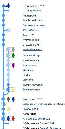 Филёвская линия Москвы, ранее носила название Арбатско-Филёвская,( на карте изображена голубым цветом) — четвёртая линия Московского метрополитена. Длина 14,9 км, 13 станций. Конечные пункты остановки Александровский Сад, Крылатское и Деловой Центр.
