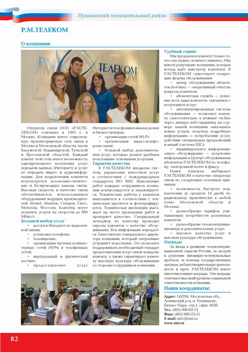 Клиенты выбирают Р.М.ТЕЛЕКОМ в качестве оператора связи по следующим основным причинам: возможность быстрого подключения (в среднем 14 дней) по радиоканалу практически в любой точке Московской области и Москвы; разнообразие тарифов, учитывающих потребности различных клиентов; разнообразие телекоммуникационных и дополнительных услуг; высокое качество услуг и высокая культура обслуживания.