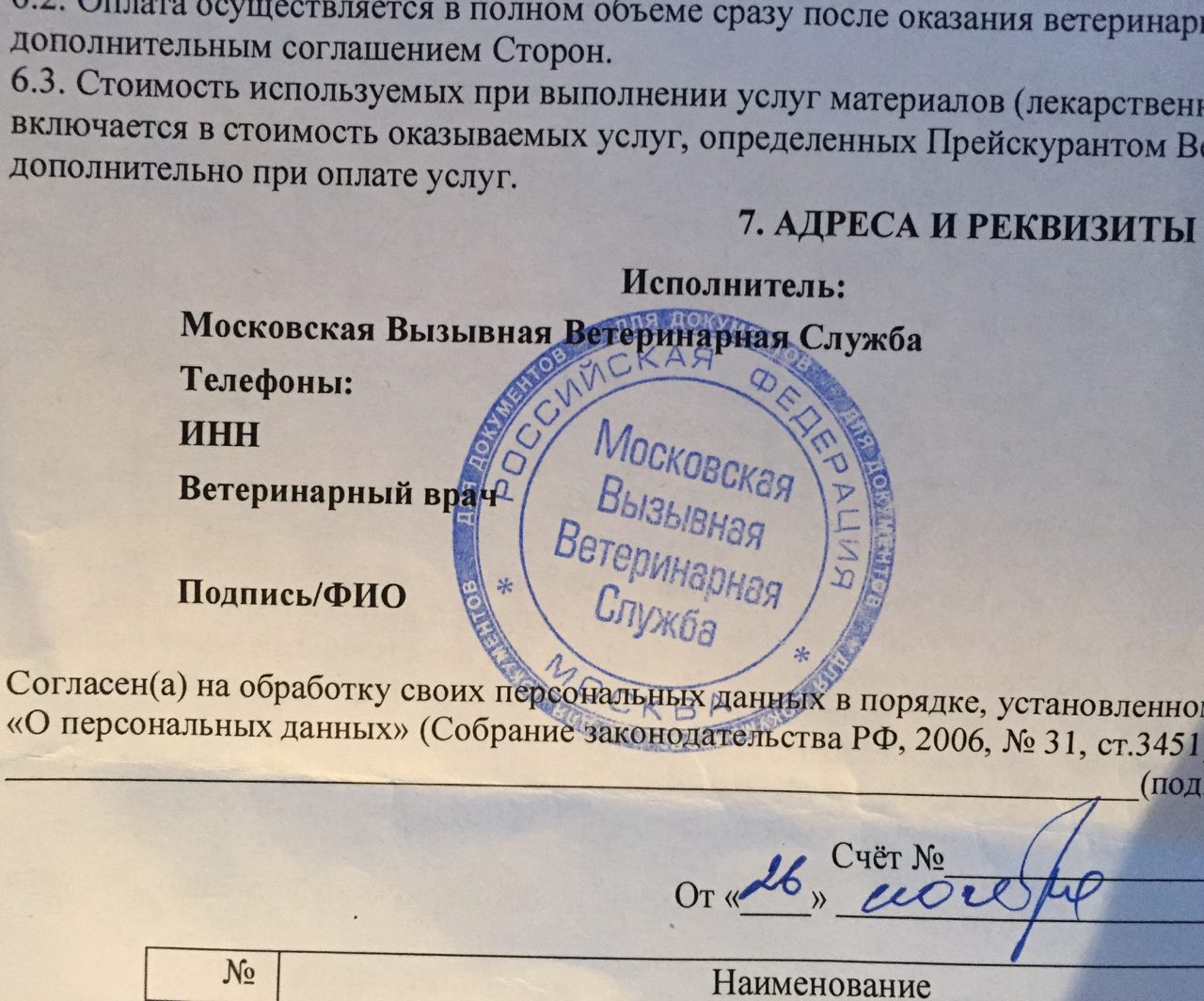 Договор с Московской вызывной ветеринарной службой, но в нем нет ни реквизитов, ни ФИО директора, а печать липовая с одним названием!