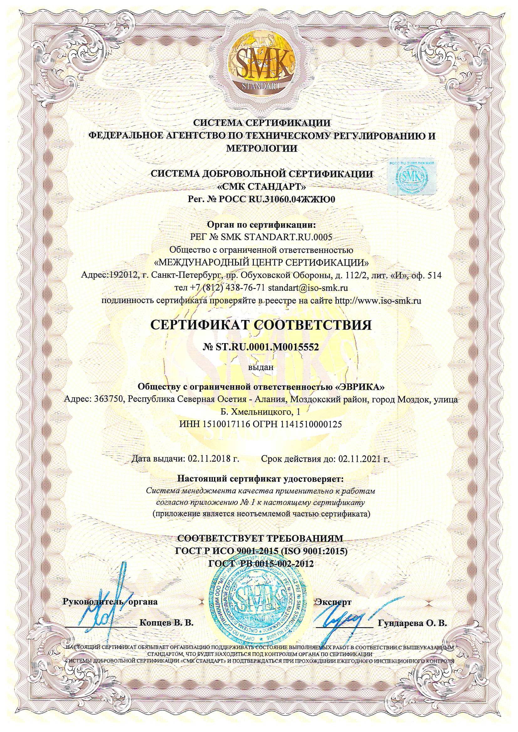 20 сентября 2020 г.Благодарим компанию Пролицензия за оперативное и качественное оказание услуги: помощь в получении сертификата соответствия системы менеджмента качества требованиям ГОСТ Р ИСО 9001:2015 (ISO 9001:2015), ГОСТ РВ 0015-002-2012. Очень приятно, что к нам проявили индивидуальный подход, что очень влияет на результат! Надеемся на дальнейшее сотрудничество и покорение новых вершин. Рекомендую!