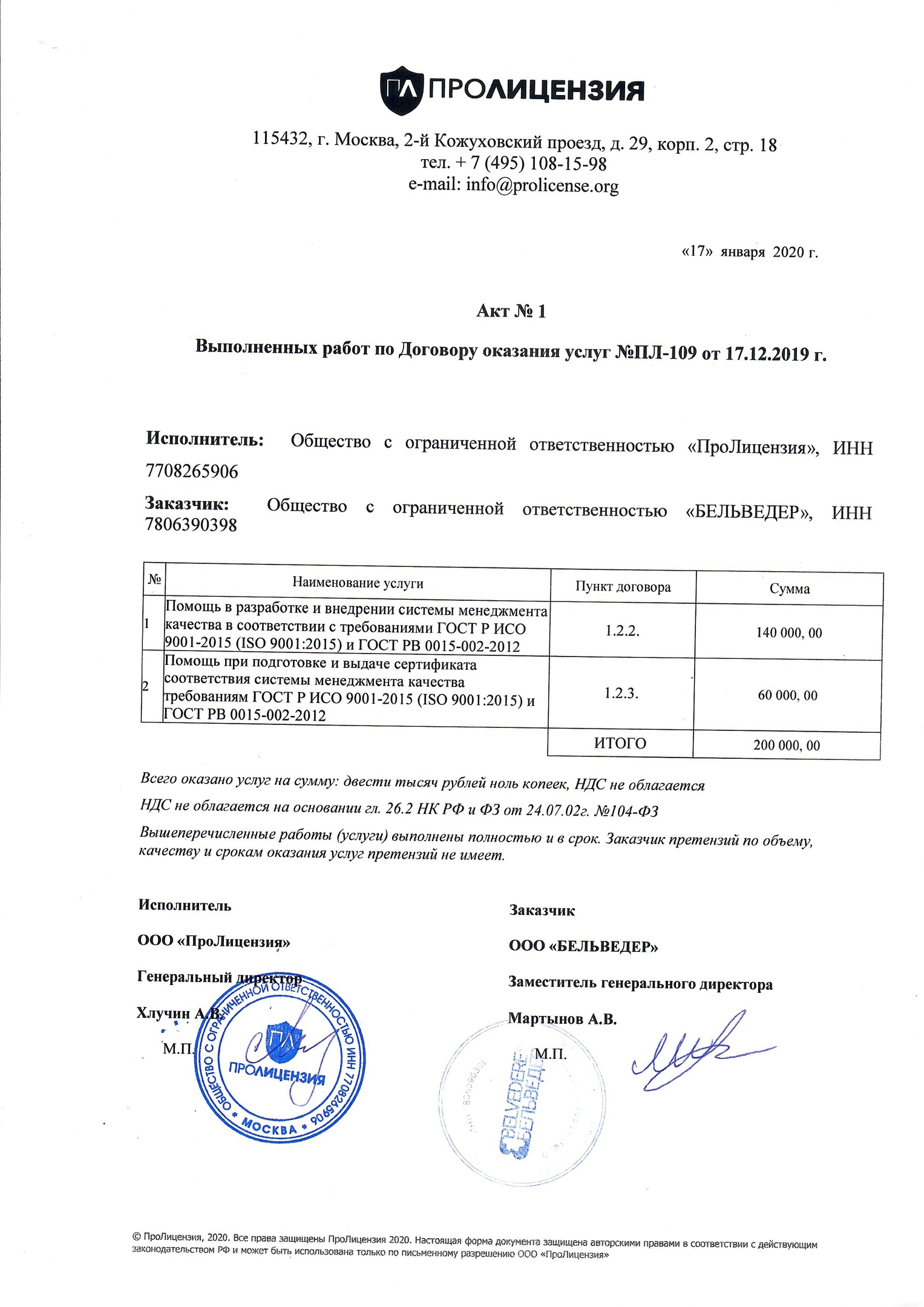 ООО «Бельведер» выражает искреннюю благодарность компании «ПроЛицензия» за оказанную помощь юридических услуг, а именно: разработка и получение сертификата ГОСТ РВ, разработка и внедрение Системы Менеджмента качества ГОСТ РВ 0015-002-2012, Внедрение Системы Менеджмента Качества в соответствии с требованиями ЭС РД 010-2015 на основании разработанной системы ГОСТ РВ 0015-002 на предприятии, помогли оборудовать склад «под ключ» с учётом всех деталей и требований по ЭКБ, пройдена квалификация в ЦОС «Электронсерт» и получено свидетельство квалифицированного поставщика ЭКБ, а также получили сертификат ISO 9001. Рекомендуем к сотрудничеству и желаю дальнейшего процветания!