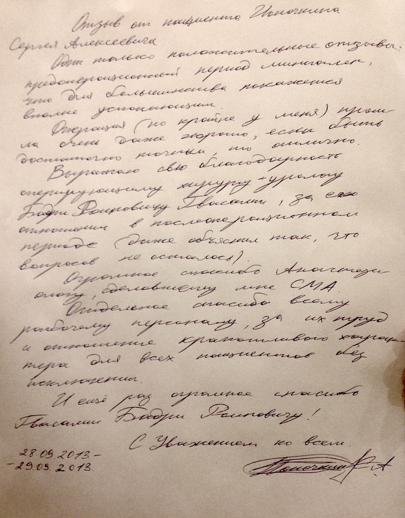 Одни только положительные отзывы: предоперационный период минимален, что для большинства покажется вполне успокаивающим. Операция (по крайней мере у меня) прошла очень даже хорошо, если быть достаточно точным, то отлично. Выражаю свою благодарность оперирующему хирургу-урологу Бадри Раиновичу Гвасалия, за его отношение в послеоперационном периоде (даже объяснил так, что вопросов не осталось). Огромное спасибо анестезиологу, делавшему мне СМА. Отдельное спасибо всему рабочему персоналу за их труд и отношение кропотливого характера для всех пациентов без исключения. И еще раз огромное спасибо Гвасалия Бадри Раиновичу.
