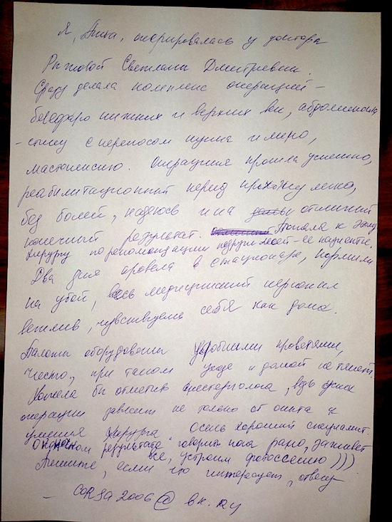 30 сентября 2013 г.Обслуживание в клинике выше всяких похвал. Персонал доброжелательный и предупредительный. Операцию провели качественно, анестезия подействовала отлично. После операции врач все объяснил и назначил последующее лечение. Качество питания отличное. Палаты в отличном состоянии. Пациент, Марченко А. Б. 23.09.2013.