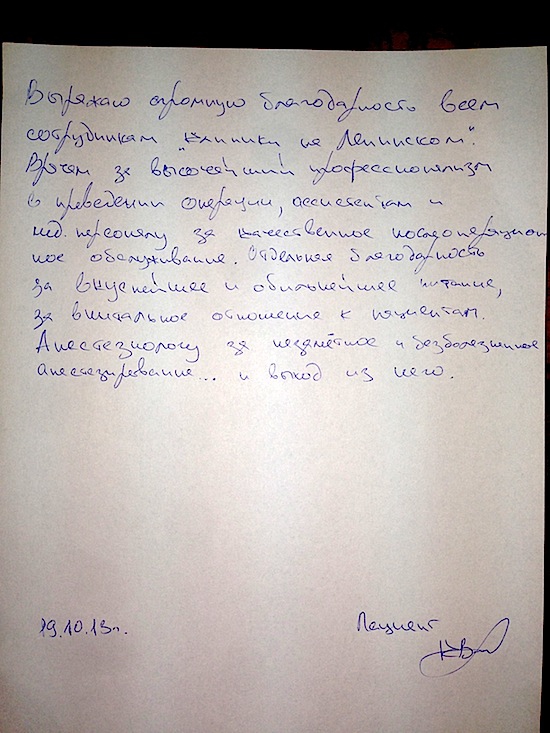 27 сентября 2013 г.Впечатления от клиники на Ленинском замечательные: медперсонал вежливый, гостеприимный и, главное, профессиональный. Очень порадовало, что на вторую операцию сделали скидку, чем осуществили возможность ее проведения (финансовую возможность). Еще хотелось бы отметить качественную работу анестезиолога и, конечно же, хирурга с ассистентом. С уважением клиент, Иван Сергеевич. P. S. Палата, ее обслуживание и питание - просто супер!!