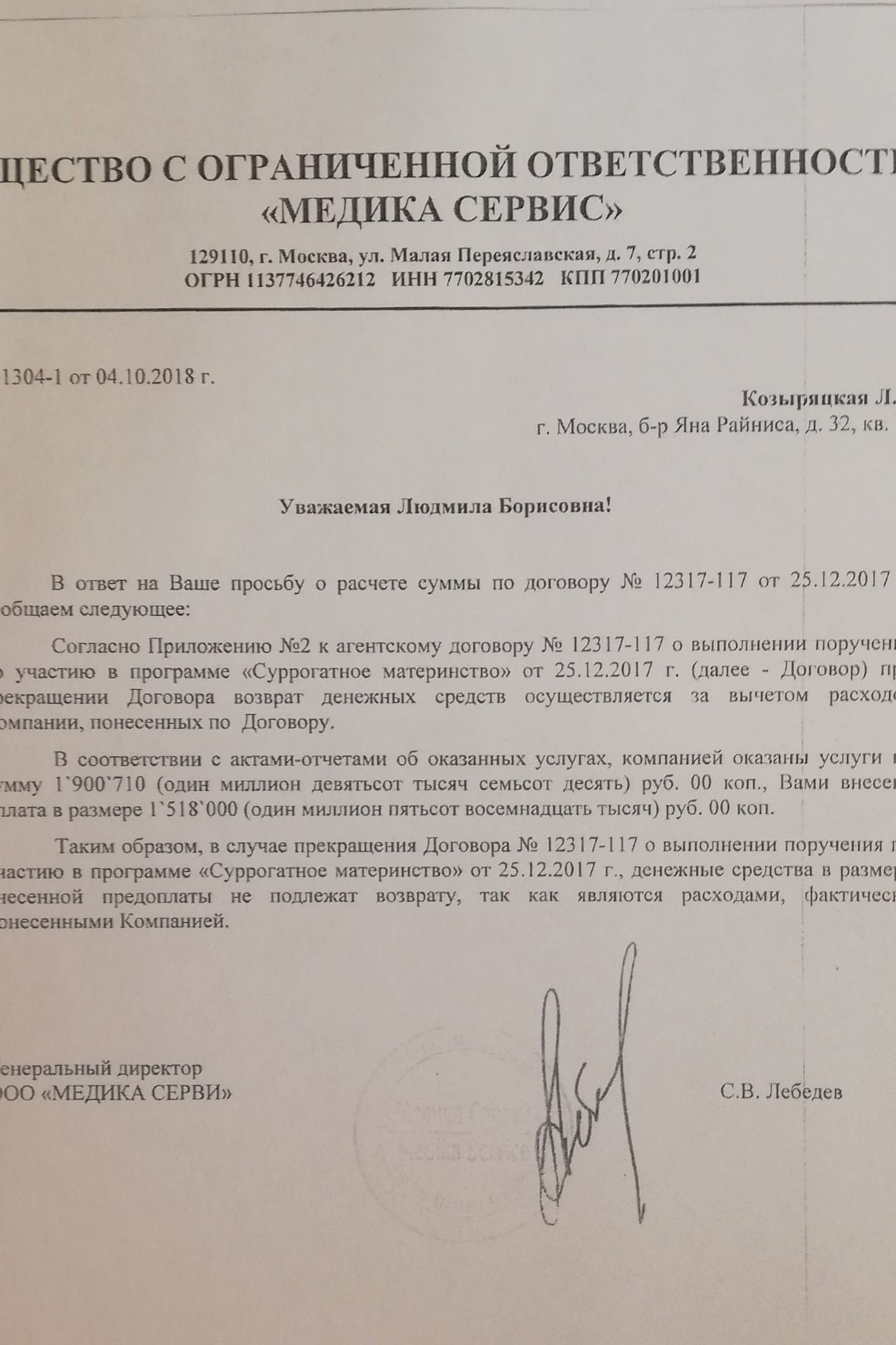 Я буду проклинать всю жизнь день, когда я пришла в это место. Я еще заработаю эти 1,5 млн. руб, на которые меня нагрели, а вот тех 4 эмбрионов, которые я сделала в свои 40 лет 7 лет назад в другой клинике и принесла к ним, надеясь дать им жизнь - уже никогда не получу. И никогда не будет своих детей. Я была готова работать по 12-14 часов в удаленных регионах, в 50 градусный мороз, полярную ночь или день, как угодно, зарабатывая на...! Заключила договор Патронаж, Хамидова Наргиза убеждала, что НИКТО от них не уходит без детей, звонила женщина, договариваясь о встрече в роддоме своего малыша. Договор по акции стоил 2160 т.р, но это если все сразу наличными, а у меня было только 1,5 млн, потому и заплатила 1518 тыс. руб. (потом еще должна была 1000 тыс. руб) - черными - дали корешок к ПКО. Дала доверенность на свои сокровища и стала ждать. Последовали акты - 1 акт - услуги агентства - 1млн., 2 акт - 1 перенос -420 т.р., усл. аген. 270 т.р., 3 акт - 2 перенос - 242 т.р., усл. аген.- 90 т.р., 3 акт - 234 т. р, усл аген.- 90 тыс. руб. Когда после второго переноса СНОВА все не удалось, я спросила - как так, что будет, если снова ничего не получится. Наргиза сказала очень ХАМОВИТО- Вы НИЧЕГО от нас не получите. Да, у них после 1 и 2 акта (это после первого как-бы "переноса") уже сумма по актам 1450 т. р., зачем что-то делать еще, если уже наличка черными получена? Договор у них такой! А вот эмбрионы очень редкой группы крови куда дели? У меня не было ни данных сурмам - только ФИО, но это ни о чем, а перенос должен делаться только после заключения договора с сурмамой. Я подписывала эти договора во второй фирме - ЦЕНТР-ЭКО, но мне вторые экземпляры не дали.Данных их анализов - нет, копий тестов ХГЧ - Наргиза сообщала по ватсапу. Никаких документов о расходах они не предоставляют (противоречит ГК РФ, но кому до этого дело). На запрос они не отреагировали, вернее прислали мне расчет того, что их услуги, вернее "расходы" составили 1903 тыс. руб.за подписью того самого ЛЕБЕДЕВА С.В, который выступает по ТВ, рассказывая об ужасах самостоятельного поиска сурмам, только АГЕНТСТВО - гарантия успеха (см. мой случай). Как же гарантии, что они обещают - за отказ сурмамы от выдачи ребенка - штраф - вы ж ее не видели никогда. А если она сбежит на 3-4 месяце? Вы вообще тут бесправны, они просто скажут - не удалось. Я понимаю, что есть % неудач, но если бизнес ПРОЗРАЧЕН, если есть отчетность и контроль! Я не думала, что в этой сфере возможно как в лихие 90-е,этот ГОП-СТОП по-медицински. Они отобрали у меня все! Зато я буду 7 лет платить кредит на удовольствия руководства Свитчайлд, да и плевать! Я просто хотела детей и обратилась не в ту контору! Прости мама, из-за моей доверчивости ты никогда не увидишь внуков. Мы мечтали зря! Простите меня, Дети. Я не хотела, чтобы так получилось!