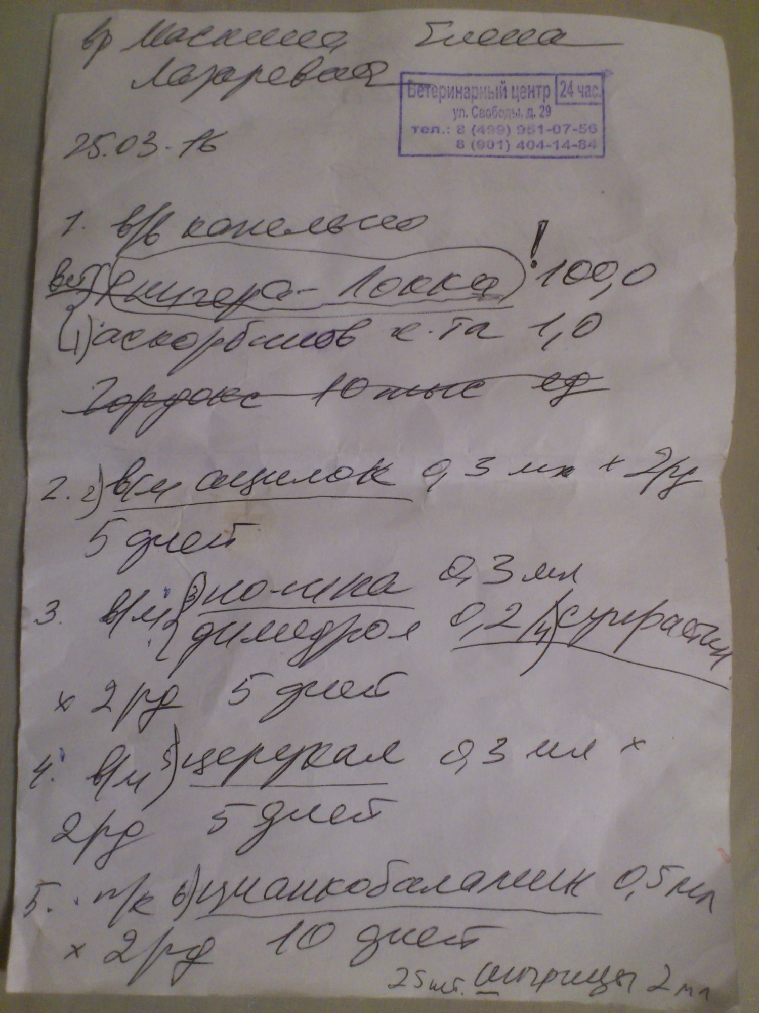 Я говорю о их ветеринарном центре.24 часа. на Ул. свободы, д. 29 тел:8(499)9510756. Врач, которая нас осматривала и выписывала назначение 25.03.2016,
