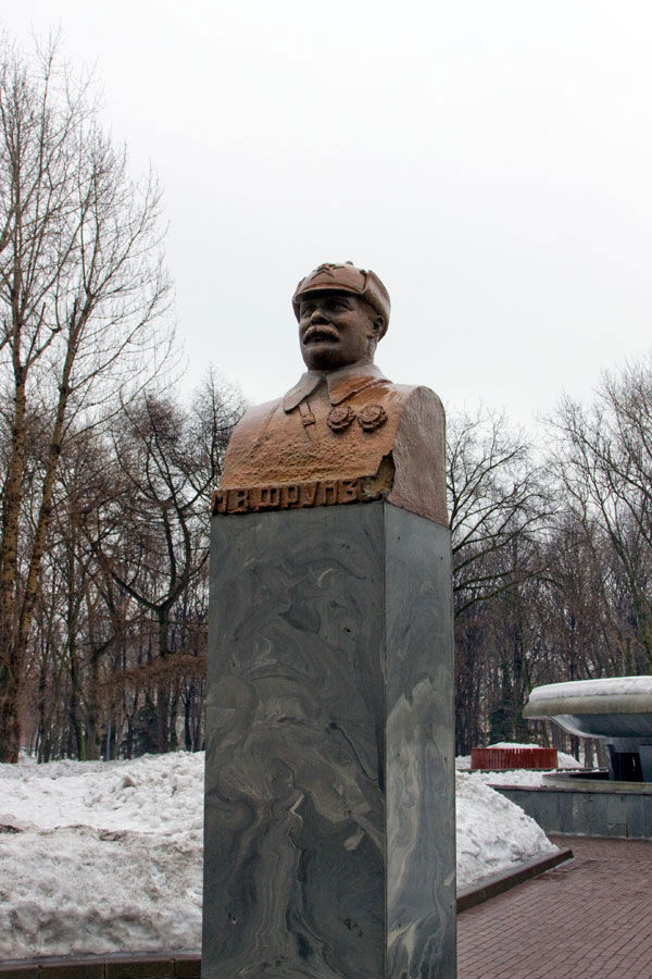 Гранитный памятник Фрунзе установлен в 1927 году в сквере Девичьего поля в Москве. Памятник Фрунзе находится около Военной академии. Правдивый образ воина - большевика, кристально чистого человека создан рукой скульптора С. Д. Меркурова. Памятник Фрунзе представляет собой бюст, установленный на прямоугольный в плане пилона гранитный постамент. В скульптуре изображен в образе командира, в военной форме, при орденах, в буденовке. На бюсте надпись: «М. В. Фрунзе».