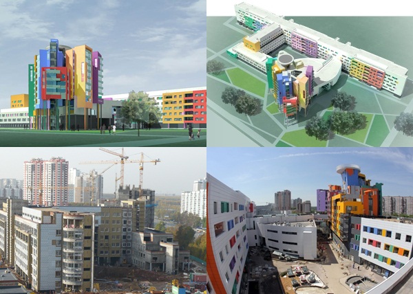 При проектировании ФНКЦ ДГОИ им. Рогачева учли рисунок Димы – здание имеет необычный современный дизайн и яркие, радующие глаз цвета.