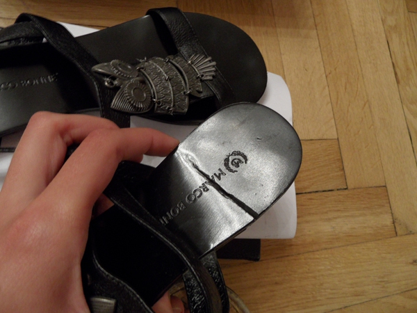 Купила себе в начале августа сандалии. На вид красивые. Но не очень удобные - подошва слишком жёсткая и скользкая. Сверху на сандалиях были пришиты проволокой металлические совы. Одела буквально два раза - сова на одном сандалии начала отрываться! Кое как сама пришила. А недели через 2, подошва просто взяла и треснула! Там, где начинается каблук.