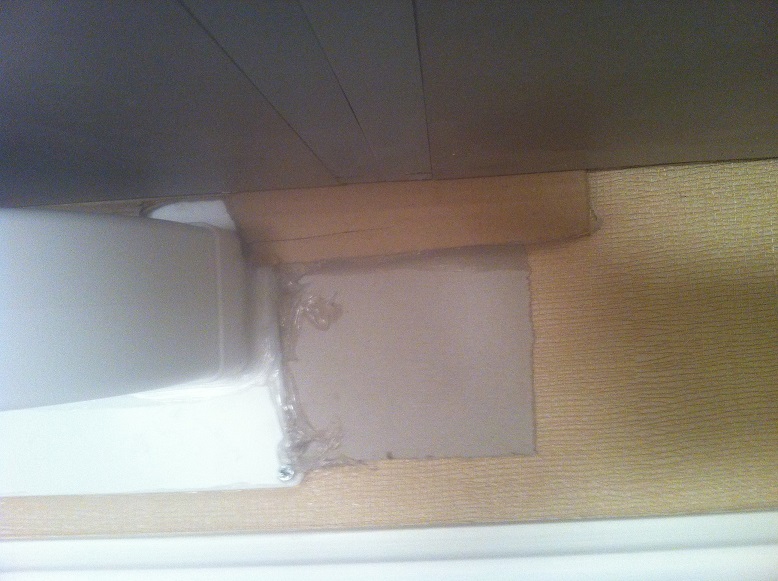 10. Полез смотреть как сделана вытяжка, мебельщик ошибся с размерами -выходной короб вытяжки был меньше отверстия на стене. Мебельщик закрыл открытое пространство КАРТОНКАМИ ИЗ ПОД УПАКОВКИ ТЕХНИКИ (даже в один кусок не уложился).