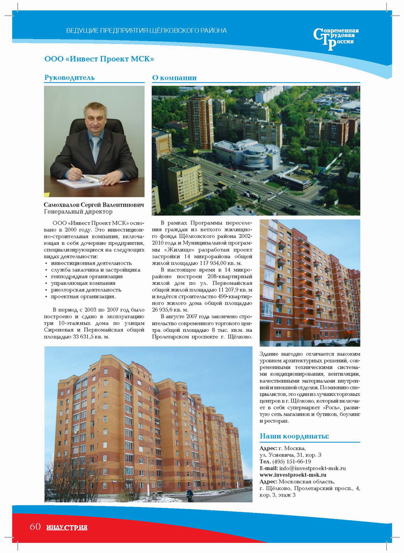 ООО «Инвест Проект МСК» основано в 2000 году. Это инвестиционно-строительная компания, включающая в себя дочерние предприятия, специализирующиеся на следующих видах деятельности: инвестиционная деятельность, служба заказчика и застройщика, генподрядная организация, управляющая компания, риелторская деятельность, проектная организация.
