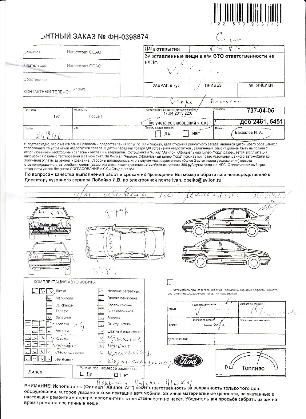 Мастер бригады, как я понимаю, тот человек который выпускает автомобиль после ремонта и он должен был это все проверить, признал ошибку компании Авилон-Форд и предложил оставить автомобиль до 2 Мая. Заказ-наряд находится внизу документа, в котором от руки отмечено, что автомобиль оставлен по рекламации 30,05,2013 г.