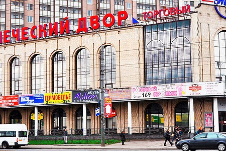 Торговый центр «Купеческий двор» находится на Коломяжском проспекте Северной столицы Российской Федерации. Здание комплекса стоит между жилыми корпусами, примыкая к одному из многоэтажных домов. В нескольких метрах работает станция метро «Пионерская», в двух километрах есть еще одна станция - «Удельная».