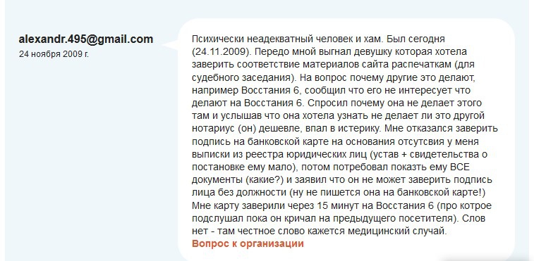 Психически неадекватный человек и хам. Был сегодня (24.11.2009). Передо мной выгнал девушку которая хотела заверить соответствие материалов сайта распечаткам (для судебного заседания). На вопрос почему другие это делают, например Восстания 6, сообщил что его не интересует что делают на Восстания 6. Спросил почему она не делает этого там и услышав что она хотела узнать не делает ли это другой нотариус (он) дешевле, впал в истерику. Мне отказался заверить подпись на банковской карте на основания отсутсвия у меня выписки из реестра юридических лиц (устав + свидетельства о постановке ему мало), потом потребовал показть ему ВСЕ документы (какие?) и заявил что он не может заверить подпись лица без должности (ну не пишется она на банковской карте!) Мне карту заверили через 15 минут на Восстания 6 (про котрое подслушал пока он кричал на предыдущего посетителя). Слов нет - там честное слово кажется медицинский случай.