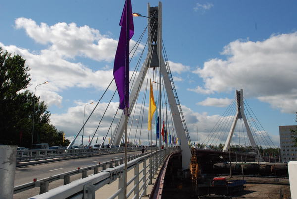 Путепровод проходит через ж/дорогу от улицы Ивановской до проспекта Славы города Санкт-Петербурга. Добраться до объекта можно на автобусе (№№ 76, 12, 11, 140, 91, 56), троллейбусе (№№ 29, 26, 36, 42, 27), маршрутном такси (№№ 56, 401, 170, 388, 339, 227, 11к, 12, 27, 29, 49) до остановки «Проспект Славы (ул. Софийская)» или на метро до станции «Ломоносовская», затем – пешком около 1 км.