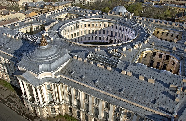Необычное архитектурное сооружение прямоугольной формы, длиной 140 метров и шириной 125 метров, включает в себя четыре прямоугольных корпуса, внутрь прямоугольника вписан кольцеобразный корпус, диаметром 55 метров. Главный фасад обращен к Неве и украшен тремя ризалитами и скульптурными копиями античных статуй Геркулеса и Флоры. Купол главного корпуса увенчан статуей Минервы - покровительницы ремесел и искусств, в окружении 3-х гениев художеств. 24 ноября 1837 года под куполом центрального павильона освящена церковь во имя Святой Великомученицы Екатерины. Большие полотна живописи на стенах двусветных галерей появились в середине XIX столетия.