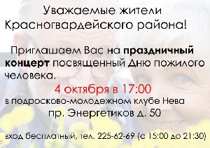 Приглашаем на бесплатный праздничный концерт, ко Дню пожилого человека в Клуб Нева, 04 октября в 17:00, пр. Энергетиков, д. 50.